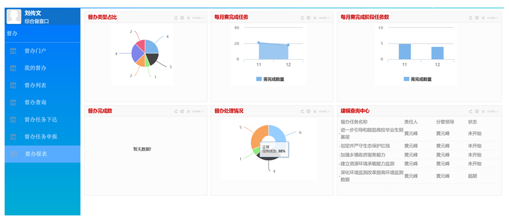 各类别任务执行进度查看,定时自动更新,自动统计,督办任务可穿透跟踪,直接反应进度,强化评价考核,加强审计监督。