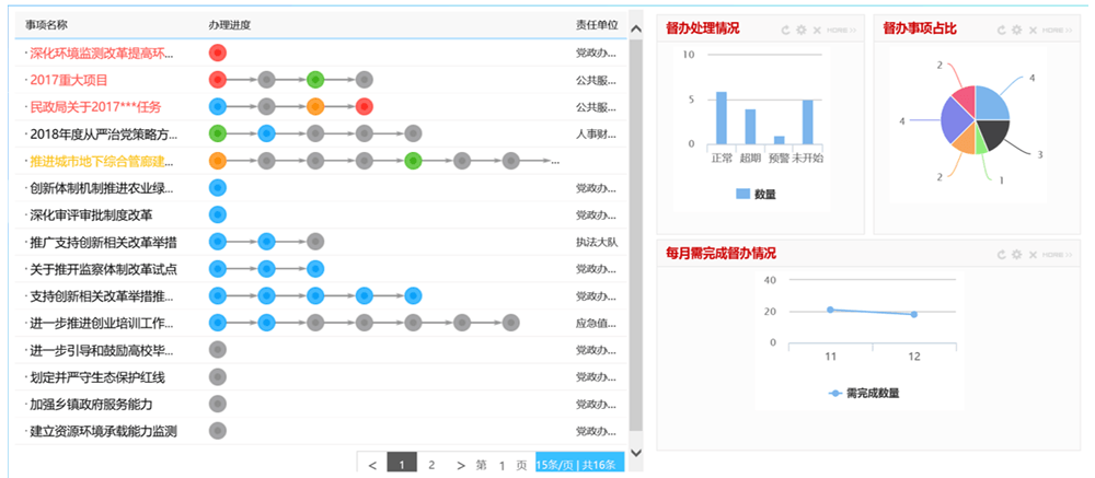 政府工作报告、重点项目、重点工程、领导交办等任务的清晰下达与督办,加强督查工作的制度化、标准化、规范化。完善工作机制,建立健全的统一领导、分工协作、上下联动、齐抓共管的政府督查工作机制。