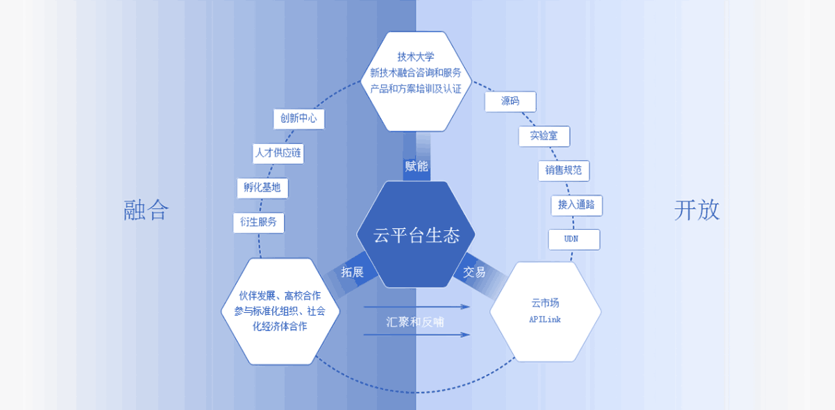 汇聚优质平台伙伴,聚焦企业服务领域,提供企业服务需要的能力,服务好最终企业用户,打通新技术与应用、企业与伙伴、产品与服务、销售与商机之间的壁垒, 以融合开放的形态为云平台筑“台”。