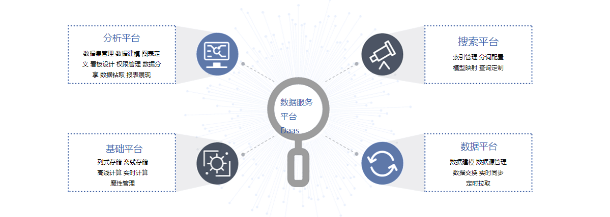 数据服务平台(DaaS)基于开源架构的大数据存储和计算平台,提供离线实时计算、数据仓库管理等基础平台服务,提供基于企业业务特点的统一搜索和数据分析平台等数据应用服务,为企业提供一站式的数据处理和分析。