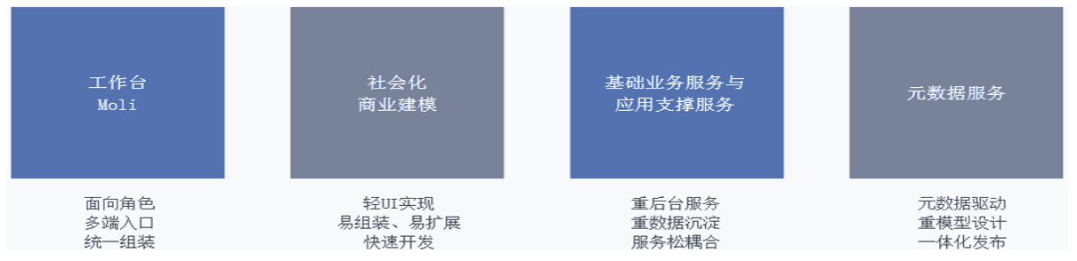 数能力服务(aPaaS)以元模型为核心为应用提供大后台元数据服务、中台基础业务及应用强支撑服务、动态建模与应用扩展能力,同时提供聚合多端入口的统一工作台服务。
