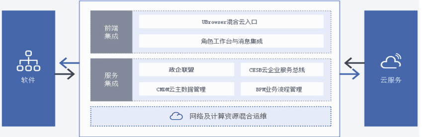 混合云服务(IPaaS)支持前端浏览器与软件入口集成,让用户自由切换,支持业务入口、流程、服务、数据等各个业务层面的集成应用,预置开箱即用适配器,能够方便地与第三方产品快速集成,全部产品架构统一,预制提供一体化方案,全阶段可视化工具支持开发、监控、维护均在统一平台完成。