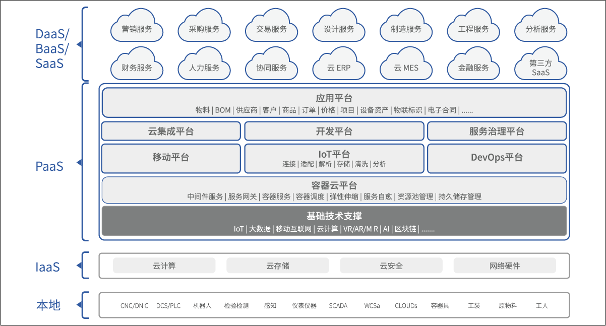 由基础技术支撑平台、容器云平台、工业物联网平台、应用开发平台、移动平台、云集成平台、服务治理平台 以及DevOps平台等组成。在基础设施、数据库、中间件、服务框架、协议、表示层,平台支持开放协议与行 业标准,具有广泛的开放性,适配不同IaaS平台,建设丰富的工业PaaS业务功能组件,包括通用类业务功能 组件、工具类业务功能组件、面向工业场景类业务功能组件。