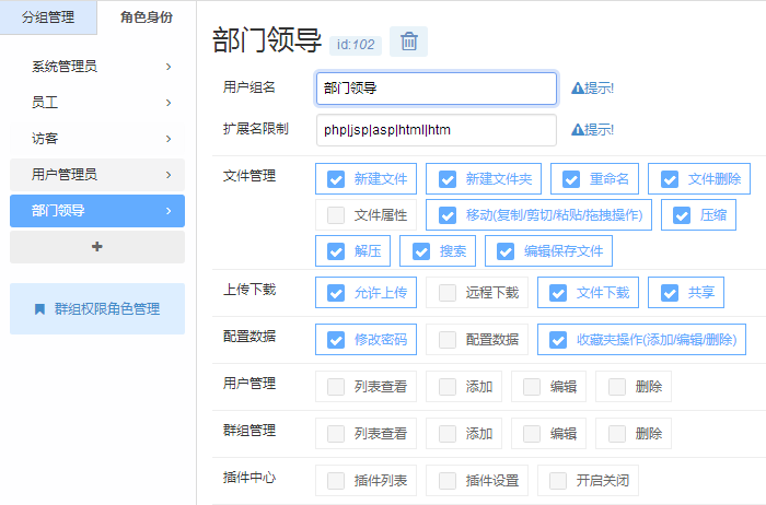 提供文件管理、上传下载、数据配置、用户管理、群组管理、插件管理等近30种不同全局权限的设置;与群组角色权限多种组合,覆盖所有业务场景。