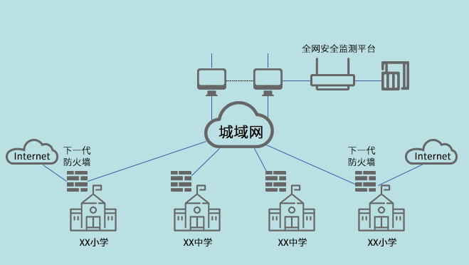 城域网全网安全监测解决方案——通过在中小学边界部署硅谷云下一代防火墙NGAF建立L2-L7层统一安全监控点,并在教育局部署安全监控平台,可真正实现教育局集中管理、中小学无人管理,安全自动维护、日志统一收集、安全统一分析的效果。