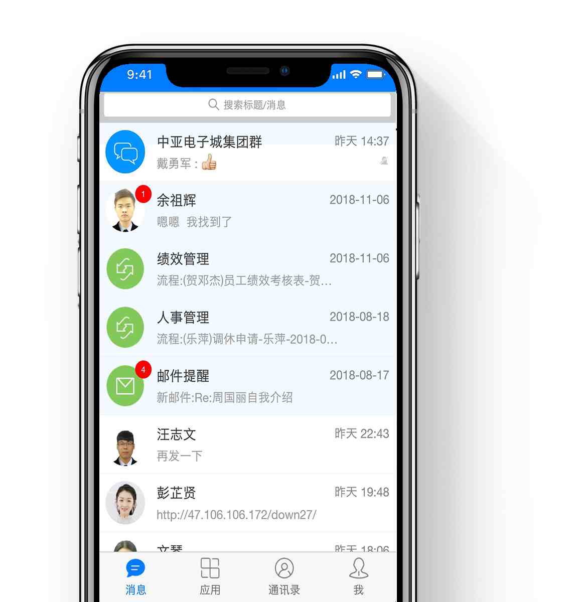 - 同企业内,无需添加对方为好友,也可在企业通讯录中找到对方,并发起聊天。